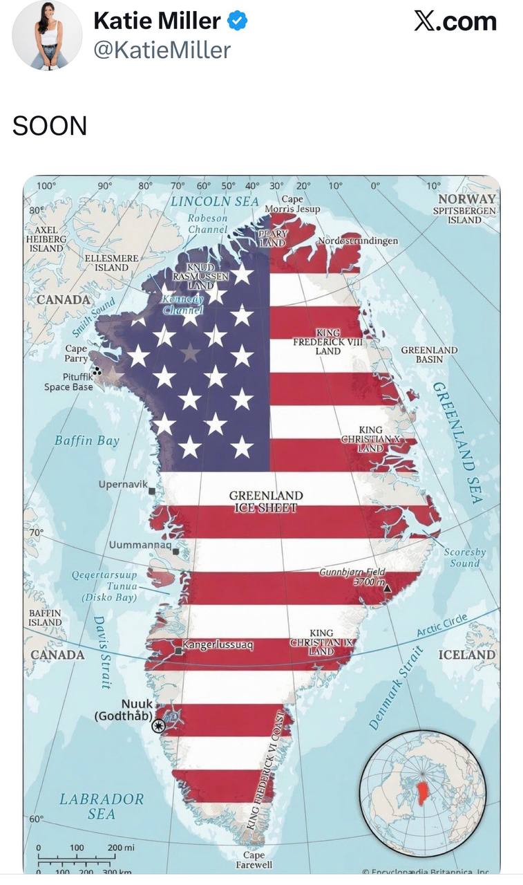 Після цього гучний міжнародний скандал спровокувала дружина радника президента Сполучених Штатів із внутрішньої безпеки Стівена Міллера Кеті, яка опублікувала мапу Гренландії, розфарбовану в кольори прапора США. До мапи вона додала лише лаконічний підпис: "Скоро".