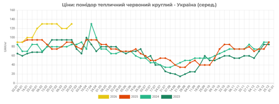 Станом на зараз ціни на тепличні помідори сформувалися в діапазоні 140-160 гривень за кілограм (3,19-3,65 долара за кілограм). Це в середньому на 16% дорожче, ніж наприкінці минулого робочого тижня.