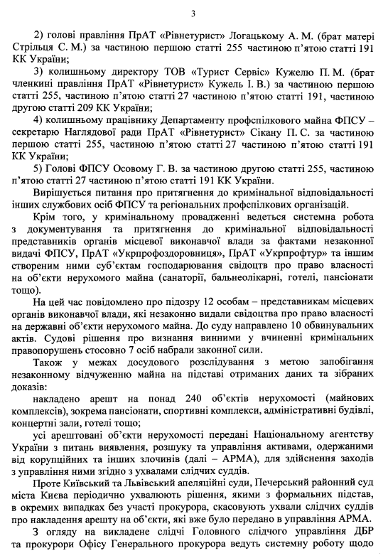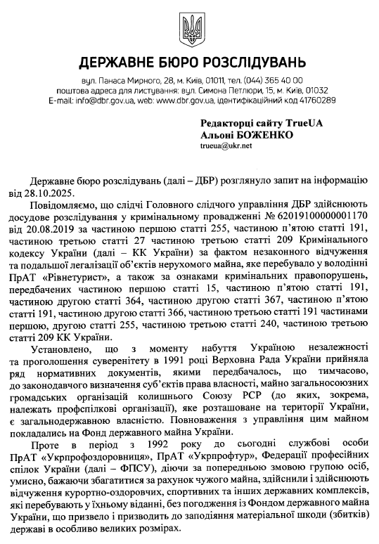 TrueUA із запитом звернувся і до Державного бюро розслідувань. Редакція поцікавилася, у скількох кримінальних справах фігурують посадовці Федерації профспілок та на якій стадії перебувають розслідування; скільки об’єктів нерухомості ФПУ передали до АРМА за результатами кримінальних проваджень ДБР; чи відстежує Бюро подальшу долю цих активів. Слідчі ж інформацію не приховують. У відповіді згадана не лише кримінальна справа, по якій заступник голови ФПУ Володимир Саєнко отримав чотири роки, а й не менш резонансна про відчуження приміщення ресторану у Рівному. Серед осіб, яким повідомлено підозру у цій справі, і голова Профспілок Григорій Осовий.