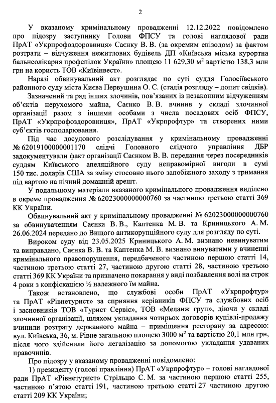 У листопаді 2023 року до суду було направлено обвинувальний акт щодо нього. За даними слідства, посадовець зі спільниками ухвалював рішення про незаконне відчуження на користь приватного підприємства будівлі державної курортної бальнеолікарні у Києві. Лікарня взагалі не підлягала відчуженню. Згідно з висновком судової експертизи, загальна вартість приміщення становила понад 138,3 мільйона гривень. Згадана особа намагалася через посередника дати хабар колегії суддів у розмірі 150 тисяч доларів США за зміну запобіжного заходу.