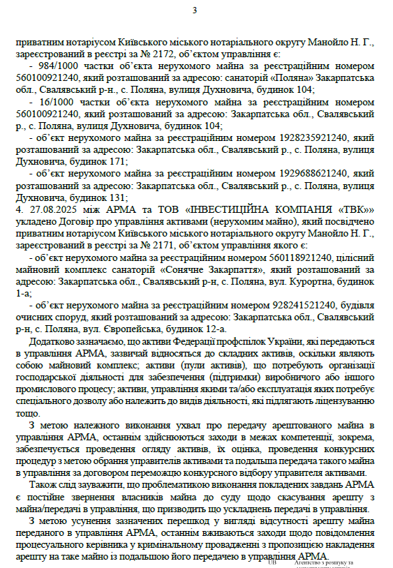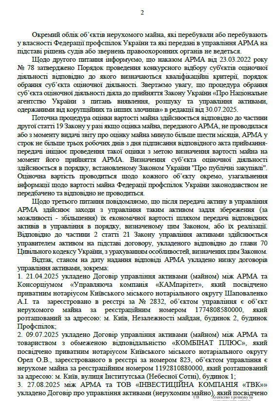 У відповіді Агентства є доволі цікаві моменти. Наприклад, що окремий облік об’єктів нерухомого майна, які перебували або перебувають у власності Федерації профспілок України та які передані в управління АРМА на підставі рішень судів або звернень правоохоронних органів, не ведеться. Як можна ефективно шукати управителів на майно, коли воно навіть не обліковане? Не відповіли конкретно і стосовно вартості майна.