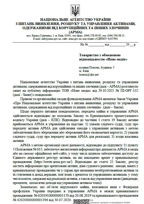 Аби з’ясувати актуальну ситуацію з об’єктами нерухомості, якими розпоряджалася Федерація профспілок, TrueUA звернувся безпосередньо до АРМА. У запиті редакція просила надати інформацію не лише про кількість таких об’єктів, а й про їхню сумарну власність та про правове і фактичне становище цього майна.