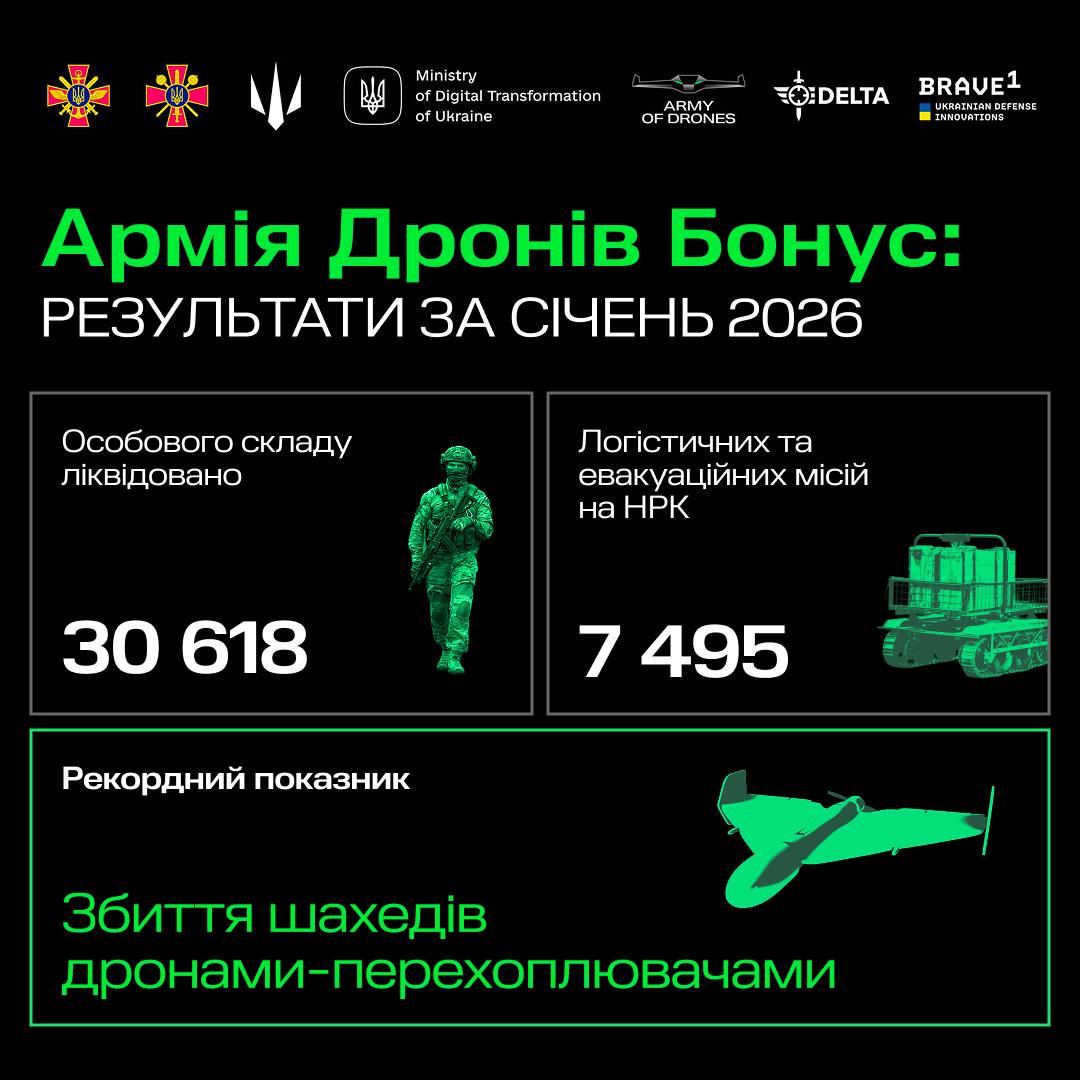 Про це повідомив міністр оборони України Михайло Федоров, який наголосив, що це результати "Армії дронів. Бонус" у січні.