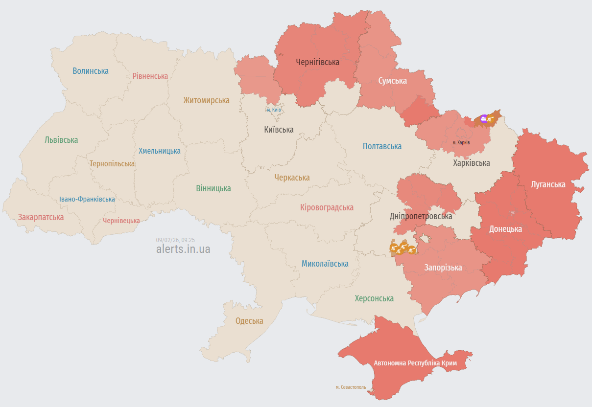 Мапа повітряних тривог станом на 09:25 має такий вигляд: