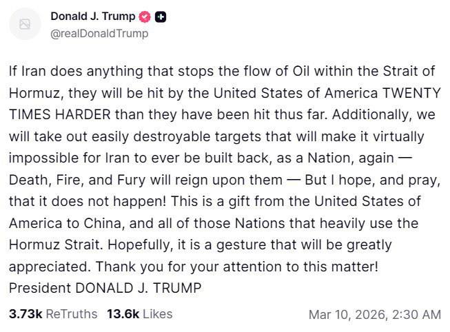 Водночас Трамп зауважив, що його попередження нібито є "подарунком США Китаю і всім країнам, які активно використовують Ормузьку протоку".