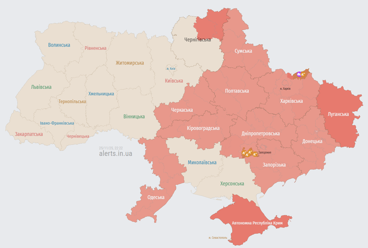 У вівторок ввечері, 25 листопада, російська армія атакує Україну ударними безпілотниками. Повітряну тривогу оголошено у низці областей.