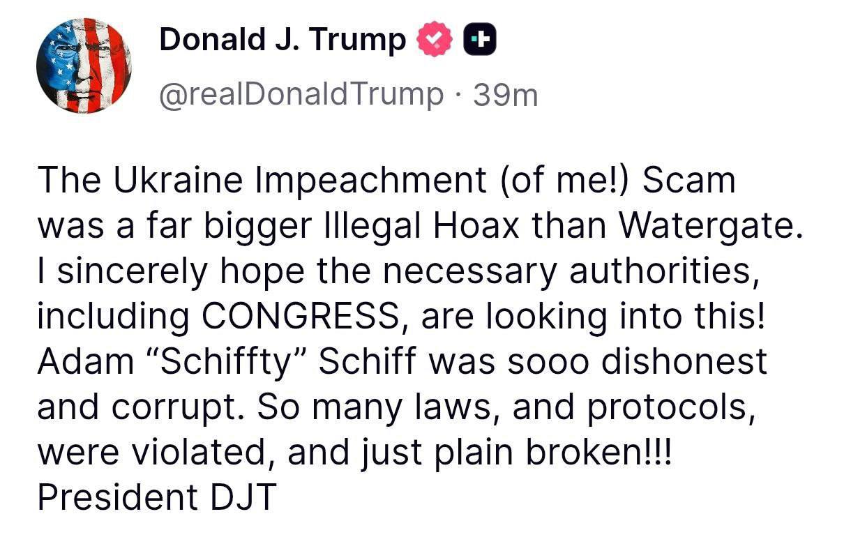 "Скандал з імпічментом в Україні (проти мене!) був набагато більшим незаконним обманом, ніж Вотергейт. Я щиро сподіваюся, що необхідні органи, включно з Конгресом, розслідують це! Адам "Schiffty" Шифф був дуже нечесним і корумпованим. Було порушено та просто зламано так багато законів і процедур!!!" — зазначив Трамп.