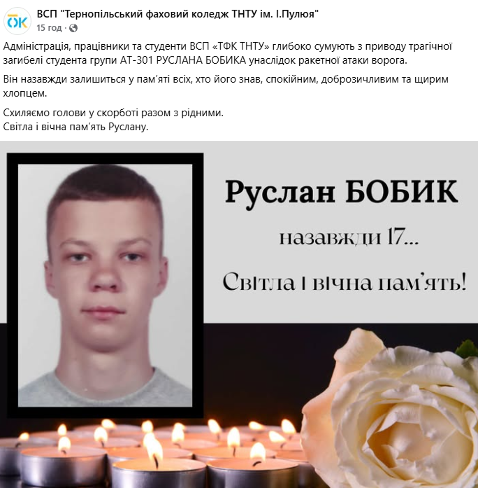 У Тернополі однією з жертв російської атаки 19 листопада став студент Руслан Бобик. Ворожа ракета вбила 17-річного підлітка просто у його квартирі.