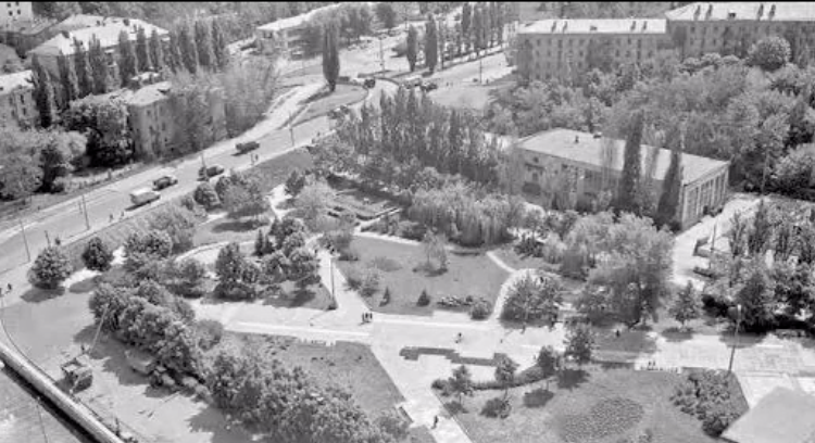 На цьому кадрі ми бачимо велику доглянуту територію. Саме на цьому місці раніше був сквер. Хоча проіснував він недовго, адже невдовзі неподалік відкрили станцію метро "Палац спорту", і пасажиропотік значно зріс. Люди, які працювали поруч, залюбки виходили сюди на перерви та вечірні прогулянки зеленою зоною.