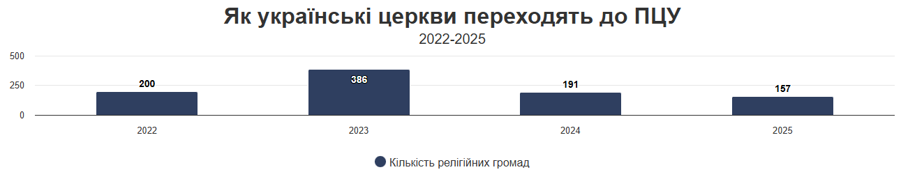 Пік переходів припав на 2023 рік — тоді змінили підпорядкування 386 громад. Торік таких було 191, а у 2025 році — 157. Варто зауважити, що перехід церкви з однієї митрополії до іншої займає тривалий час, тому дані в Єдиному державному реєстрі можуть різнитися від інформації "на місцях" та у ПЦУ.