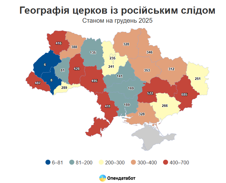 Водночас найменше церков УПЦ МП діє у Львівській області (шість) та на Прикарпатті (вісім). На сьогодні лише 18 релігійних установ із майже 8 тисяч відкрито показують свої зв'язки. Також 39 церков у держреєстрі позначені як ті, що не вказали свою приналежність до Московського патріархату. Усі вони зосереджені в Чернівецькій області.