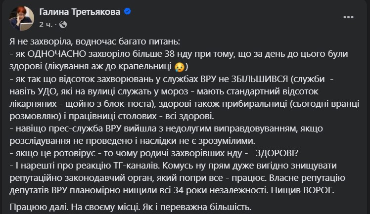 Про це повідомила нардепка від фракції "Слуга народу" Галина Третьякова. За її словами, сама вона не захворіла, а от її колегам навіть знадобилися крапельниці.
