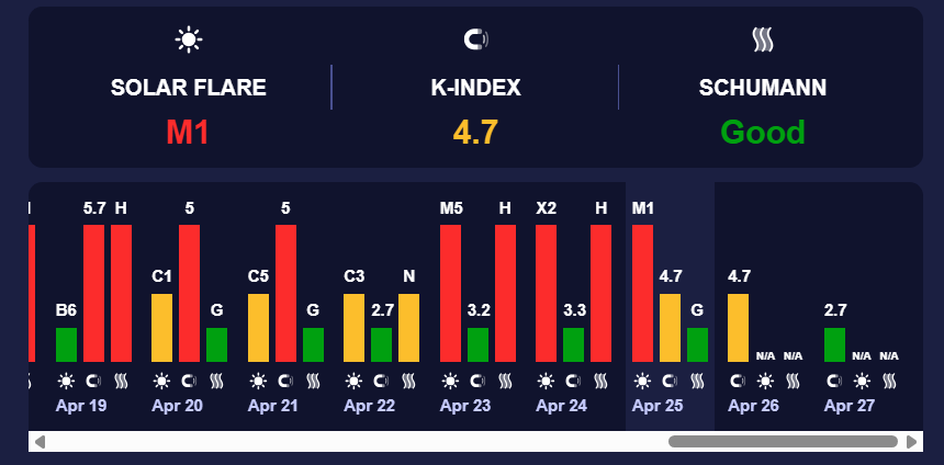 На неділю, 26 квітня, фахівці прогнозують середню магнітну активність. На Землі очікується сонячна активність із К-індексом 4,7 (жовтий рівень). Він відповідає магнітним бурям середньої потужності.