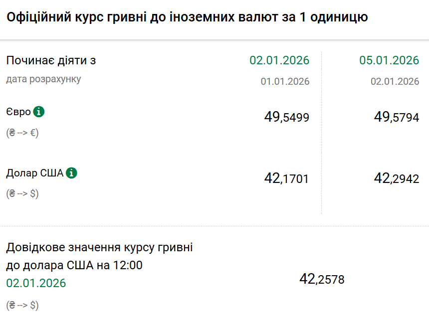 Так, на понеділок, 5 січня, Нацбанк встановив офіційний курс на рівні 42,29 гривні за один долар. Офіційний курс у п'ятницю був 42,17. На готівковому ринку долар впав на п'ять копійок — 42,50 гривні.