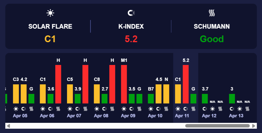 У неділю, 12 квітня, на Землі очікується сонячна активність із К-індексом 3,7 (зелений рівень). Це відповідає слабким магнітним бурям.