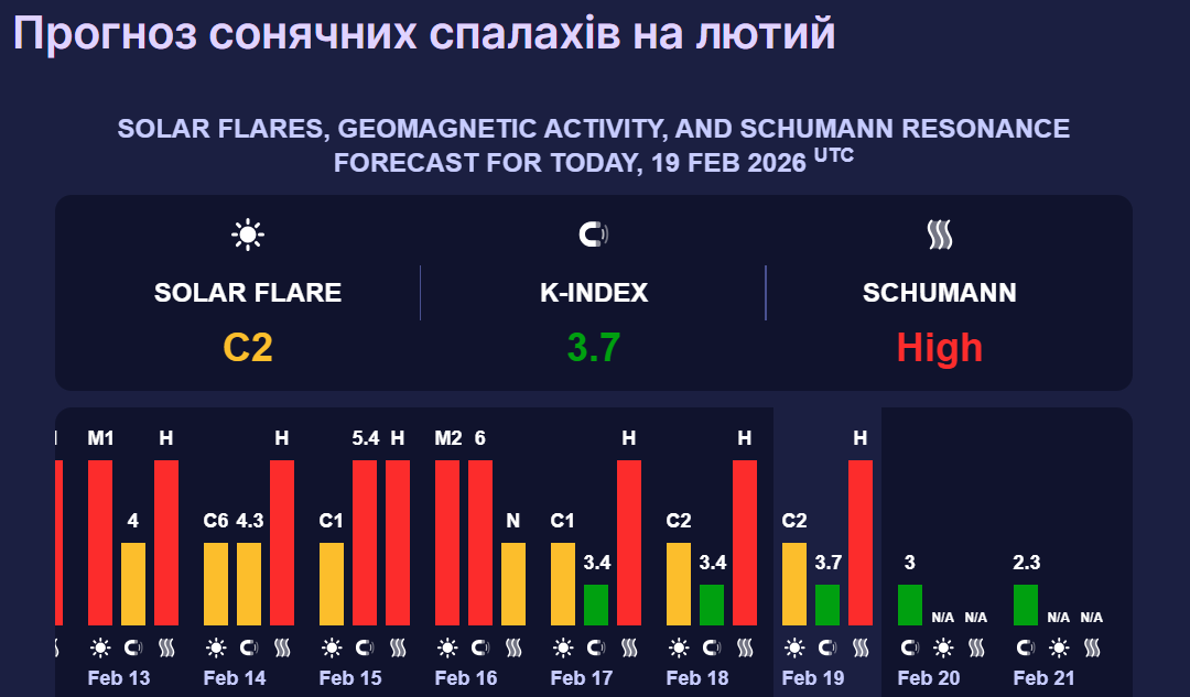 У суботу, 21 лютого, сонячна активність спаде до 2,3 бала. Такий показник також відповідає магнітній бурі зеленого рівня.