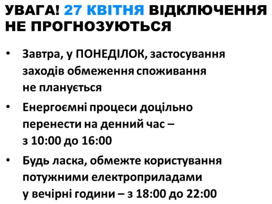 На понеділок, 27 квітня, в Україні не планують застосовувати графіки відключення електроенергії. Енергетики закликали перенести використання потужних приладів на денні години.