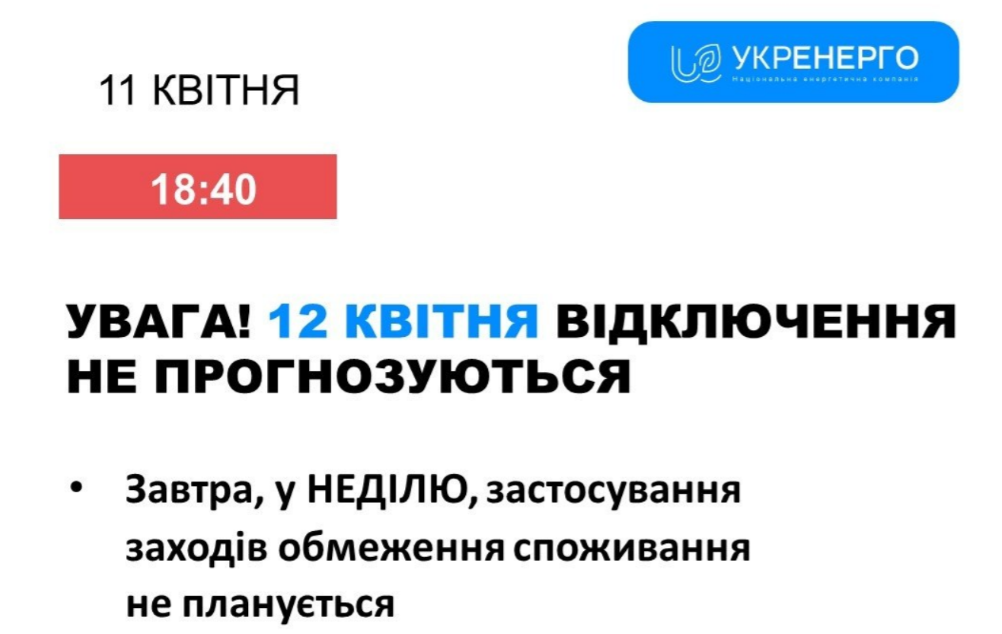 "Завтра, 12 квітня, в усіх регіонах України застосування заходів обмеження споживання не планується", — йдеться в повідомленні "Укренерго".