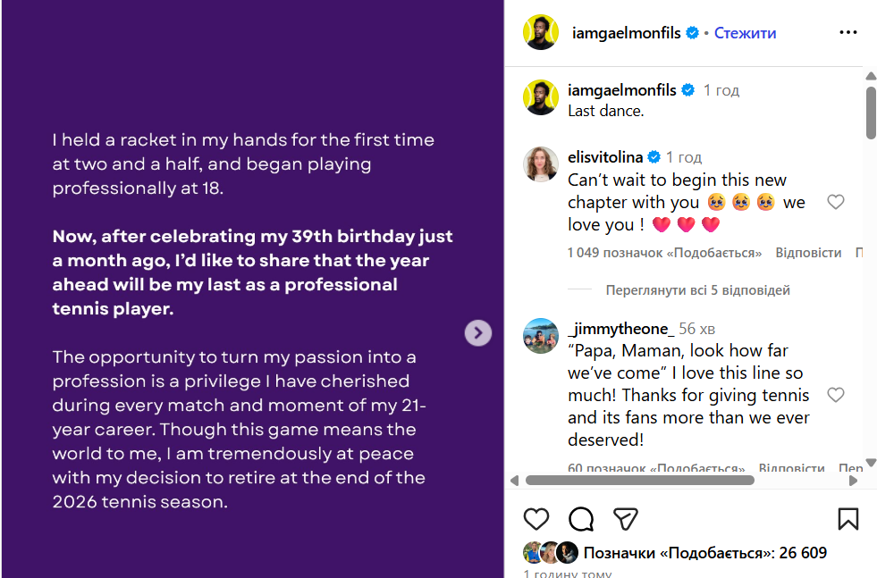 Найкраща українська тенісистка Еліна Світоліна відреагувала на рішення свого чоловіка, 39-річного французького тенісиста Гаеля Монфіса, завершити кар’єру у 2026 році.