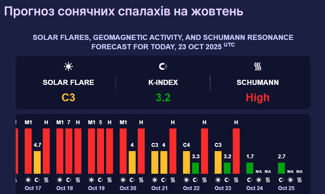У суботу, 25 жовтня, космічна погода дещо погіршиться. Зокрема, магнітні коливання не перевищуватимуть 2,7 бала (зелений рівень).