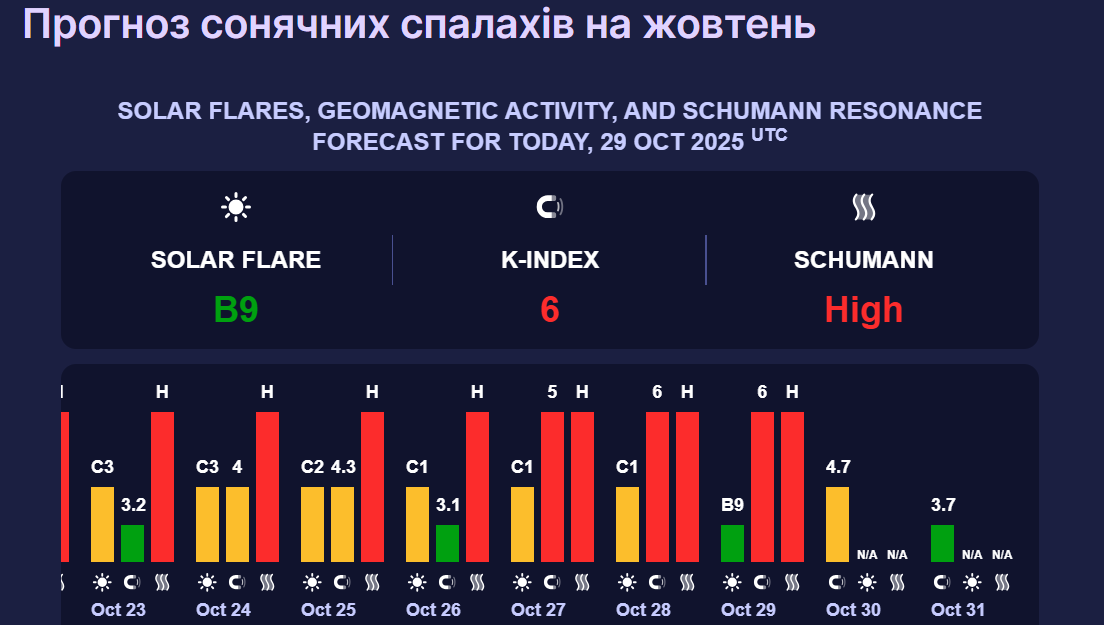 Магнітна буря червоного рівня, яка триває уже декілька днів, 30 жовтня дещо спаде. Остаточно геомагнітний шторм відступить наприкінці тижня.
