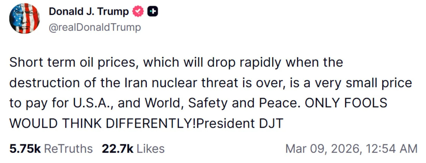 "Короткострокові ціни на нафту, які швидко впадуть, коли буде ліквідовано ядерну загрозу з боку Ірану, є дуже невеликою ціною за безпеку та мир у США та світі. Тільки дурні можуть думати інакше!" — зазначив Трамп у дописі в Truth Social.