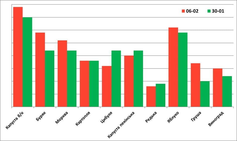 Зазначається, що пропозиція білокачанної капусти збільшилася, і вона залишається товаром торгового майданчика, що найбільше продається. Також частіше, ніж тижнем раніше, учасники продавали буряки та моркву. Водночас продажі цибулі продовжують скорочується і минулого тижня вона стала найменш продаваною позицією "борщового кошика".