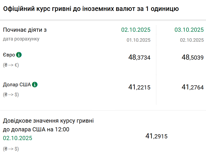 Станом на п'ятницю, 3 жовтня, Нацбанк встановив офіційний курс на рівні 41,27 гривні за один долар. Офіційний курс у четвер становив 41,22 гривні за один долар. На готівковому ринку долар зріс на п'ять копійок — 41,50 гривні.