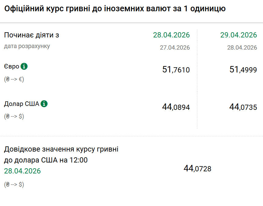 Так, на середу, 29 квітня, Нацбанк встановив офіційний курс на рівні 44,07 гривні за один долар. Офіційний курс у вівторок був 44,08. На готівковому ринку долар не змінився — 43,80 гривні.