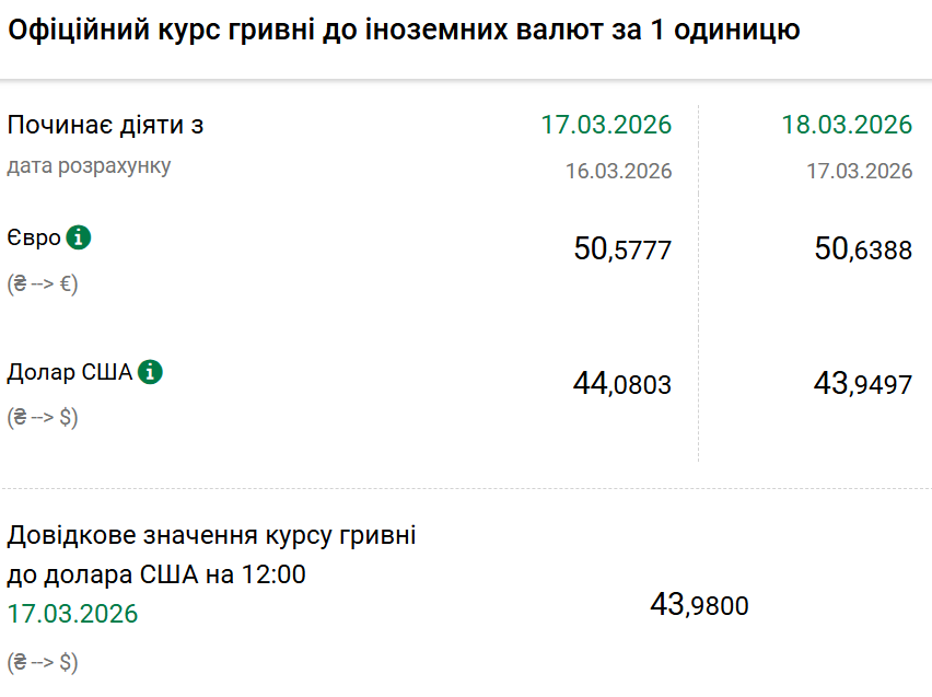 Так, на середу, 18 березня, Нацбанк встановив офіційний курс на рівні 43,94 гривні за один долар. Офіційний курс у вівторок був 44,08. На готівковому ринку долар не змінився — 43,30 гривні.