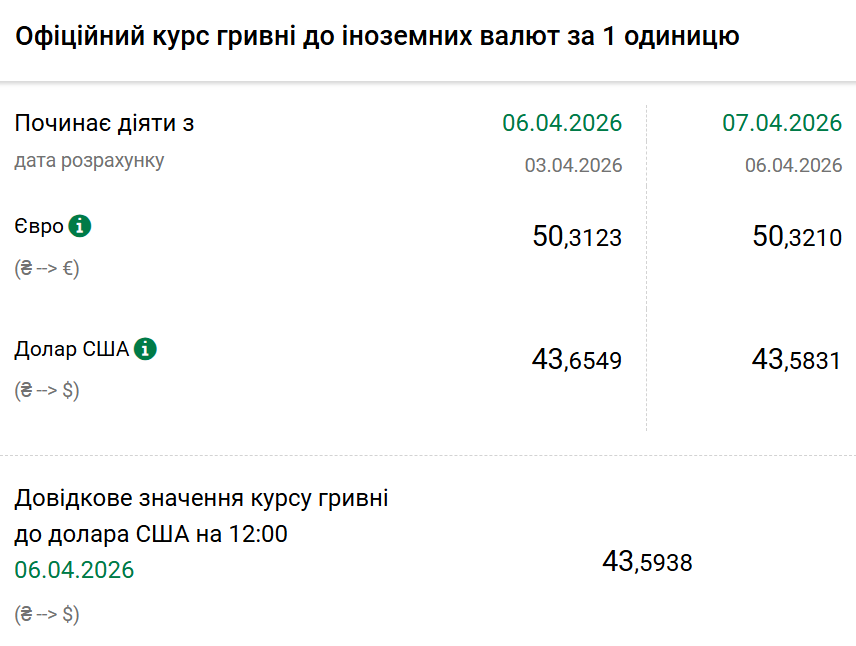 Так, на вівторок, 7 квітня, Нацбанк встановив офіційний курс на рівні 43,58 гривні за один долар. Офіційний курс у понеділок був 43,65. На готівковому ринку долар впав на 10 копійок — 43,15 гривні.