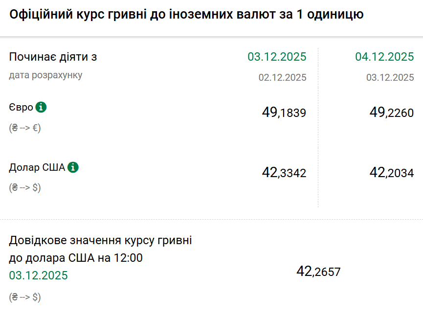 У четвер офіційний курс гривні до євро становитиме 49,22. У середу, 3 грудня, офіційний курс гривні до євро був 49,31.