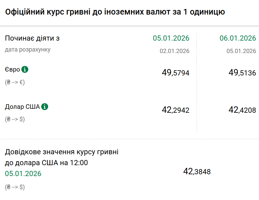 Так, на вівторок, 6 січня, Нацбанк встановив офіційний курс на рівні 42,42 гривні за один долар. Офіційний курс у понеділок був 42,29. На готівковому ринку долар впав на п'ять копійок — 42,50 гривні.