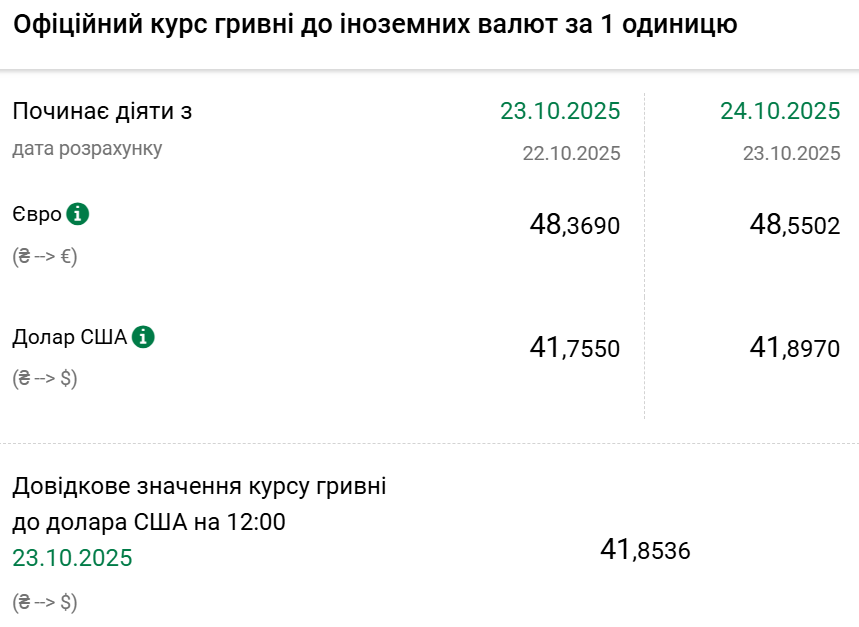 Так, на п'ятницю, 24 жовтня, Нацбанк встановив офіційний курс на рівні 41,89 гривні за один долар. Офіційний курс у четвер становив 41,75 гривні за один долар. На готівковому ринку долар не змінився — 41,95 гривні.