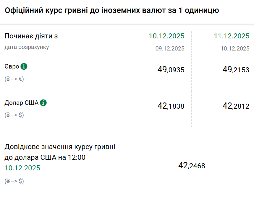У четвер офіційний курс гривні до євро становитиме 49,21. У середу, 10 грудня, офіційний курс гривні до євро був 49,09.