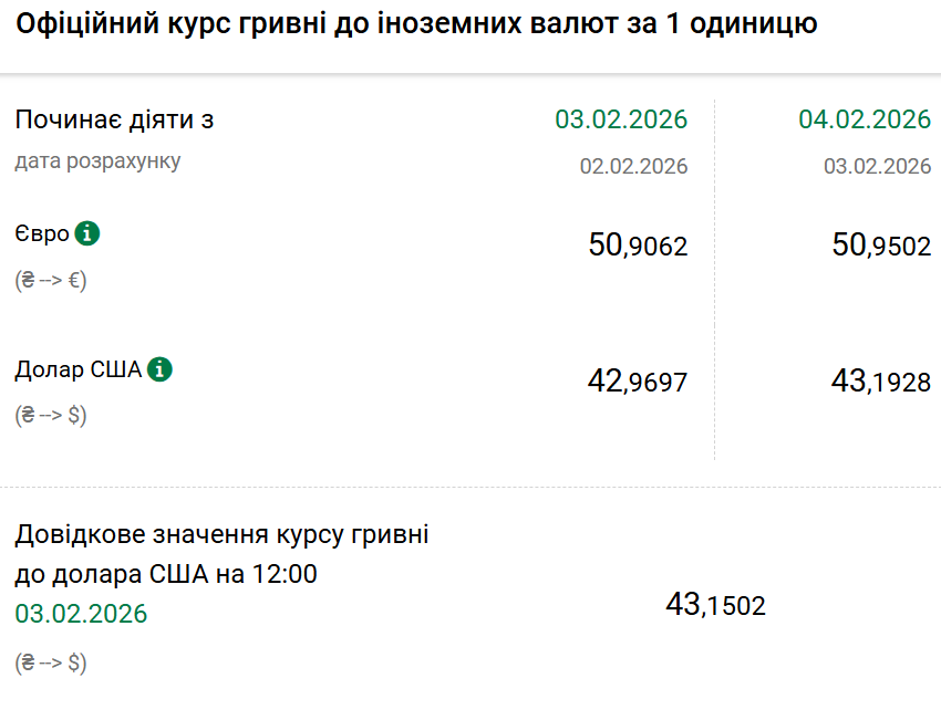 Так, на середу, 4 лютого, Нацбанк встановив офіційний курс на рівні 43,19 гривні за один долар. Офіційний курс у вівторок був 42,96. На готівковому ринку долар зріс на 20 копійок — 42,90 гривні.
