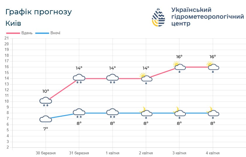 За словами синоптиків на початку тижня у столиці та на Київщині буде хмарно, йтимуть дощі різної інтенсивності. З 2 квітня опади дещо стихнуть, але не зовсім. На погодні умови впливатиме південний циклон, який переміщуватиметься з Криму.