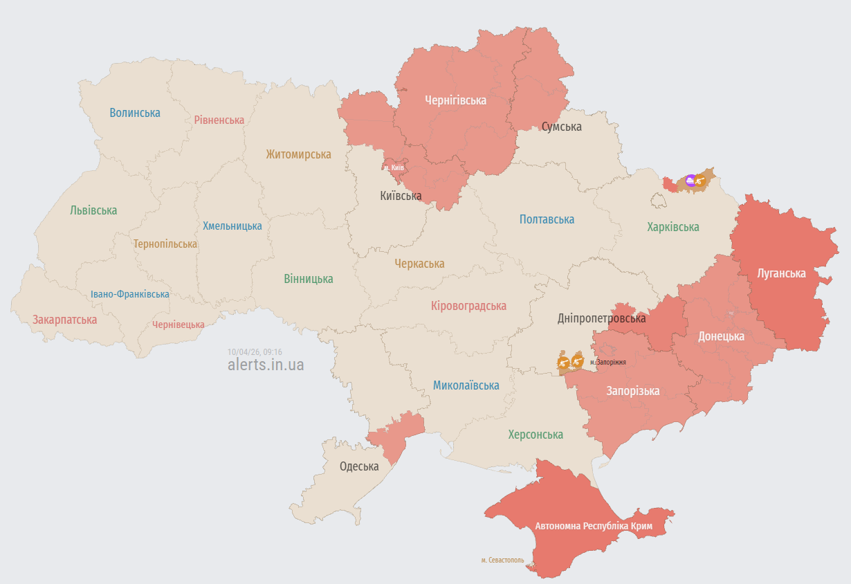 Станом на ранок п'ятниці, 10 квітня, у кількох регіонах України була оголошена повітряна тривога через чергову хвилю нальотів ворожих безпілотників, які рухалися з різних напрямків. Сили протиповітряної оборони працювали над знешкодженням цілей, що загрожували столиці та стратегічним об'єктам на Півночі та Півдні країни.