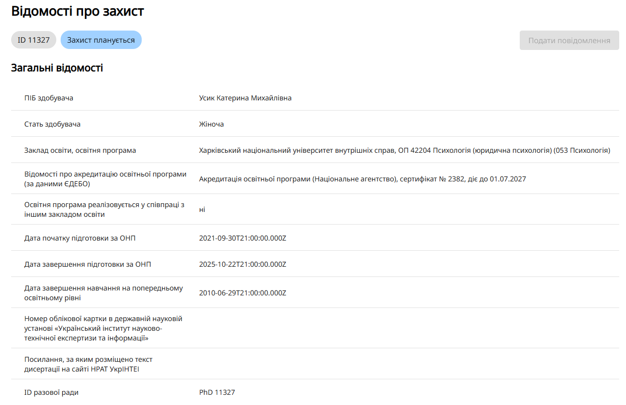 Інформація про запланований захист була оприлюднена на порталі Національного агентства із забезпечення якості вищої освіти. Захист відбудеться у Харківському національному університеті внутрішніх справ (ХНУВС) за освітньою програмою "Психологія" (спеціалізація — юридична психологія).