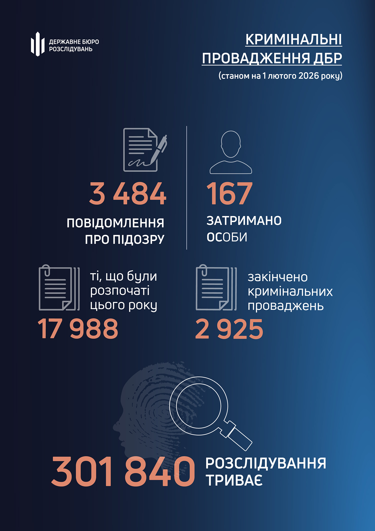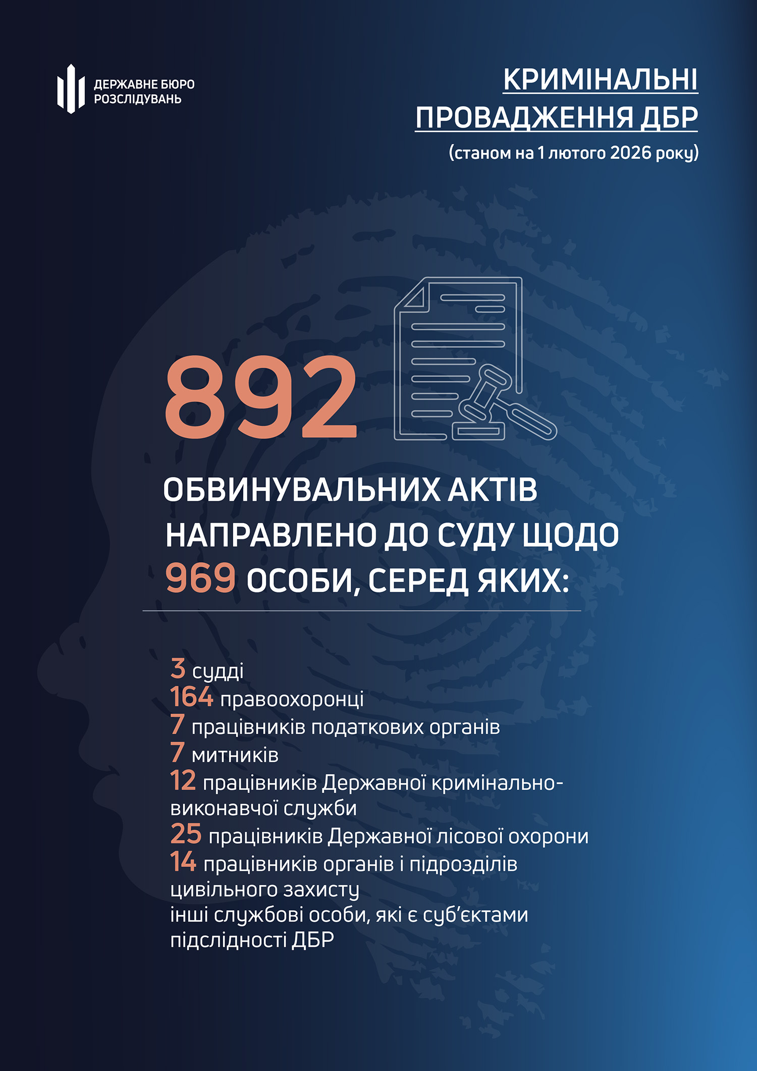 У січні співробітники Державного бюро розслідувань завершили досудове розслідування та скерували до суду 892 обвинувальні акти щодо 969 осіб. Порівняно з попереднім місяцем — груднем 2025 року — цей показник зріс удвічі.