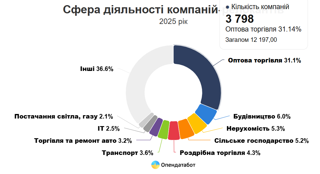 Наймобільнішими виявилися представники сфери гуртової торгівлі — майже кожна третя компанія, що змінила адресу, працює у цьому секторі (3 798 бізнесів). Також активну релокацію здійснюють компанії у галузях будівництва (6%), нерухомості (5%) та сільського господарства (5%).