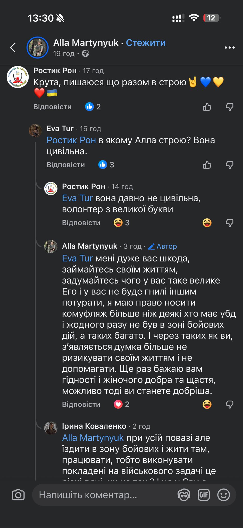 "Волонтерка Алла Мартинюк, яка позиціонує себе "близькою до фронту", вирішила пояснювати мені й іншим військовим, хто "має право" носити форму, хто "в строю", а хто "недостойний". За два коментарі "Алло, а чому ти у бойовій сорочці?" (яка, до речі, створена для носіння військовими під бронежилетом чи плитоноскою) та уточненням, що "Алла цивільна" — я отримала вибух хейту", — написала вона на своїй сторінці у Facebook.