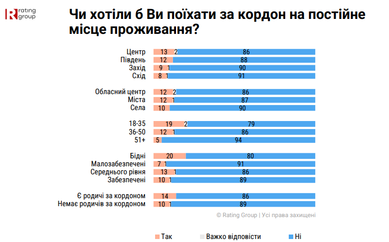 Найбільше охочих виїхати за кордон є серед молоді віком 18-35 років — 19%. Також змогли б покинути рідну країну 20% громадян, які віднесли себе до категорії "бідних".