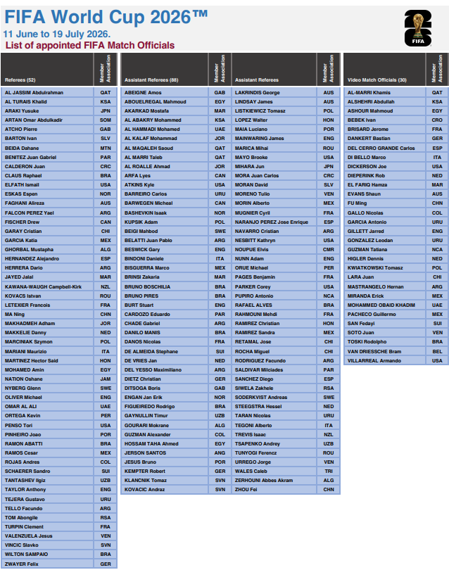 Міжнародна федерація футболу (ФІФА) офіційно оголосила перелік офіційних осіб, які обслуговуватимуть матчі майбутнього Чемпіонату світу з футболу 2026 року. До фінального списку увійшли 170 фахівців із 50 національних асоціацій, однак представників України серед них знову не виявилося.