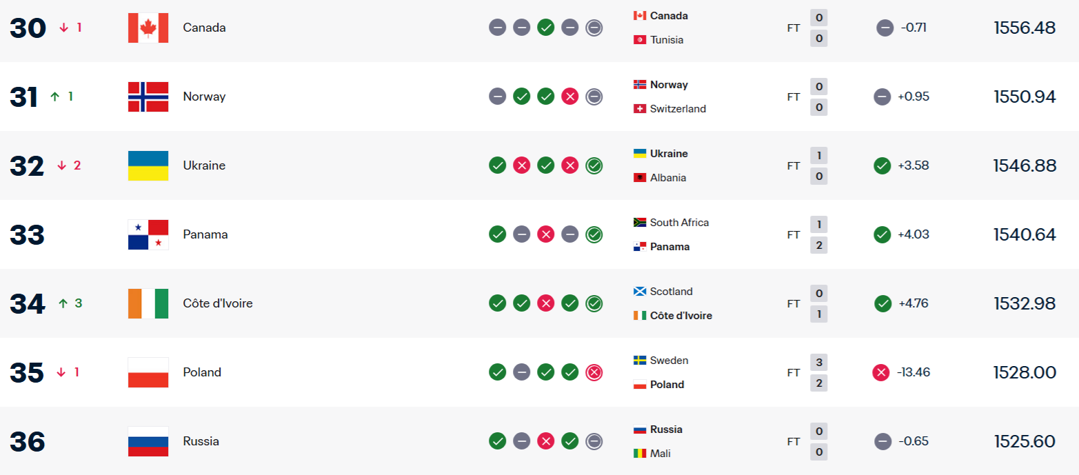 Такий показник є найнижчим результатом національної команди за останні вісім років. Востаннє Україна перебувала нижче 32 позиції у серпні 2018 року — тоді збірна посідала 35 місце, маючи 1 468 балів.