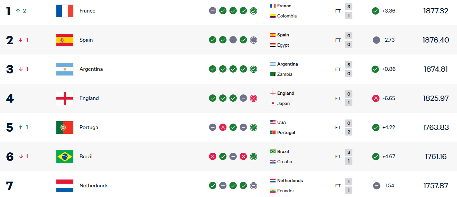 В оновленому заліку змінився лідер: перше місце посіла збірна Франції, яка після двох перемог у контрольних матчах випередила Іспанію й Аргентину.