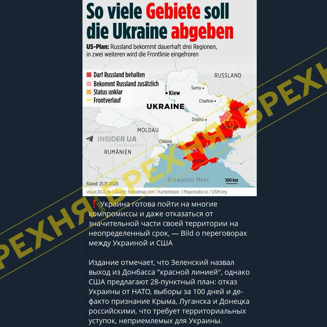 У соцмережах також демонструють скриншот зі статті BILD, на якому показано ті території, від яких Україна, згідно з американським планом, нібито "має відмовитися". Насправді ця інформація є маніпуляцією.