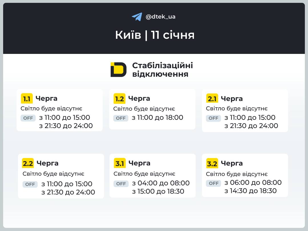На 11 січня для киян заплановано використання черг погодинних відключень електроенергії. Водночас для частини споживачів столиці графіки залишаються недійсними через тривалу дію екстрених обмежень.
