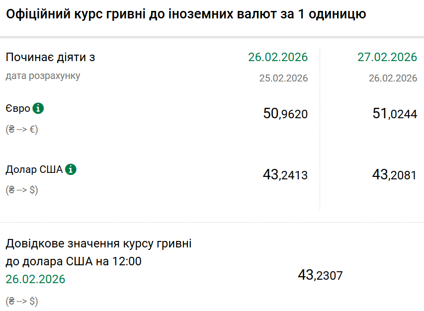 Так, на п'ятницю, 27 лютого, Нацбанк встановив офіційний курс на рівні 43,20 гривні за один долар. Офіційний курс у четвер був 43,24. На готівковому ринку долар подешевшав на 10 копійок — 42,95 гривні.