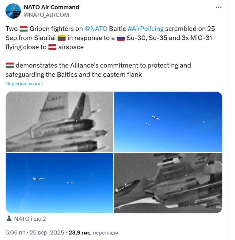Також з’явилося повідомлення про перехоплення над Балтійським морем угорськими винищувачами п’яти російських літаків, які пролетіли поблизу повітряного простору Латвії.